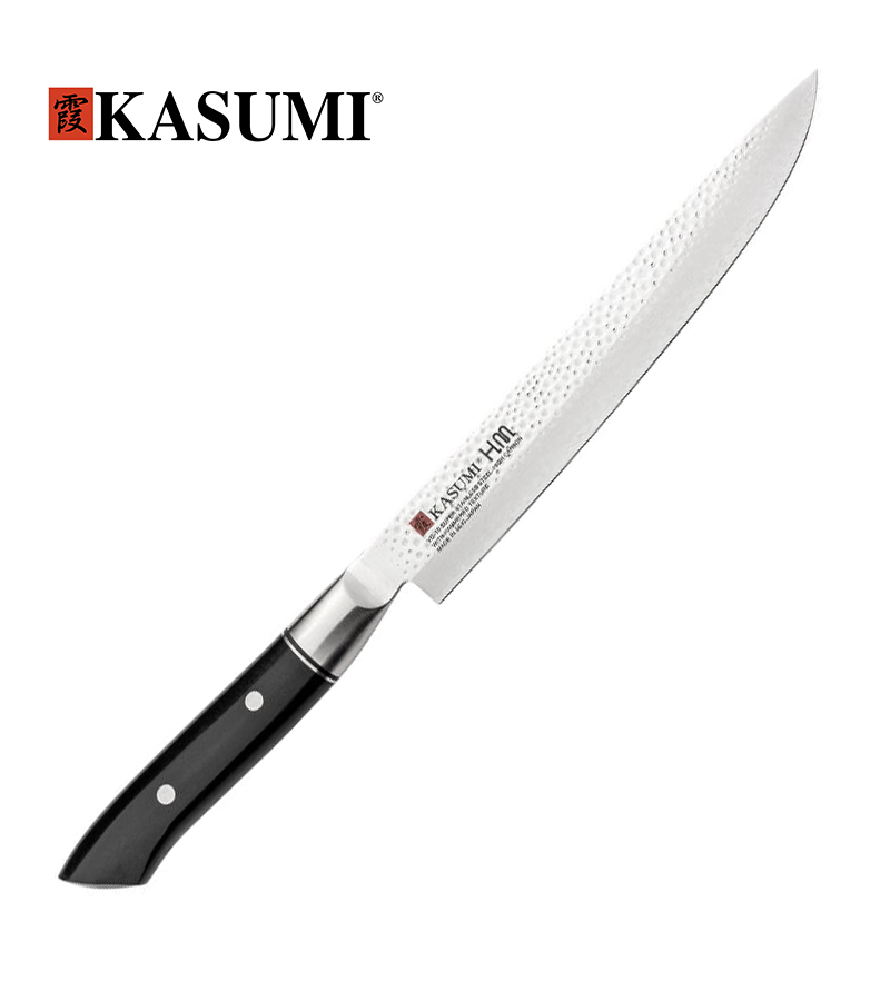 Cuchillo de trinchar japones de 20 cms Kasumi Hammered, hoja de acero inoxidable 401 y con el núcleo en acero VG-10, su dureza es de HRC-59/60. Los cuchillos Kasumi Hammered, crea un efecto antideslizante y evita que los alimentos se peguen a la cuchilla.