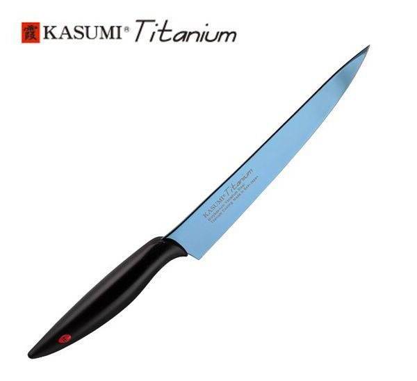 Las hojas de los cuchillos Kasumi Titanio está fabricada con molibdeno vanadio recubierto de una capa de titanio en color azul. El principal beneficio que aporta el titanio es que no es tóxico ni alérgico, y como es un material que no genera iones de hierro, evita que la comida pueda oxidarse. Los cuchillos Kasumi Titanio son muy resistente a la corrosión y a la abrasión y es muy fácil de limpiar porque es extremadamente deslizante.